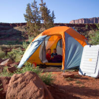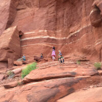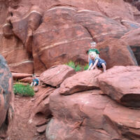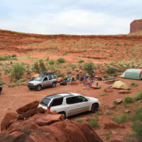 In the Moab area we managed to find a campsite that wasn’t terribly far from town, and then enjoyed lots of rainy days. I was pleasantly surprised by the number of other people I convinced to join us, and then guilty that it rained most of the trip. The arroyo right next to our campsite flooded one night, which provided some excitement. I remember engaging in copious parental oversight of small boys climbing on rocks and steep slopes (the pictures capture a bit of this). I know that one of the days we drove to Arches and hiked out to (towards?) Delicate Arch, which is the first time I did that (and the last time I need to). Arches attracts huge quantities of people, which isn’t really my outdoors thing. I also recall that we did a long drive into Canyonlands and walked around for a few minutes next to the parking lot.