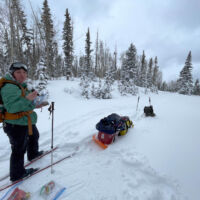 It was brutal hard work, and the kids had a really rough time. We were ridiculously slow pulling the pulks uphill in all that fresh snow. The pulks kept tipping over because the packed-down center track was higher and more firm than the surrounding snow. It was also windy, cloudy, and snowing more on us. It took us nearly five hours to go the two miles to the yurt. Multiple times I thought we were going to have to just turn around and bail back to the car.