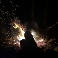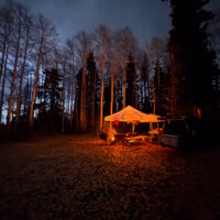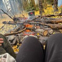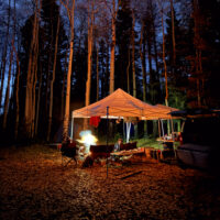 Our usual preferred spot at the end of the road was unavailable and we were rolling in around 9 PM on a Thursday night so we picked a temporary spot just to sleep for the night. The following morning we rolled back far enough to find a good spot, and it turned out to be a great choice…but for atypical reasons. Not long after setting up it started to rain, and it didn’t really stop until Sunday morning. The breeze was gentle at first but built over the weekend. The good thing is that the camp opened up to the SE and the wind consistently came from the NW so it was always filtered through the woods behind camp. The result was that we were heavily protected from the wind, and it blew consistently enough that we could bring our canopy right up to the edge of the fire pit so we could sit under the canopy but still be warmed by the fire. That’s a first for me. In all my years of camping, I’ve never before had a time when it would have been safe to put the canopy right up next to the fire like that. But the rain kept the canopy completely soaked all weekend, so there was never a danger of it drying out, getting hot and melting/burning.