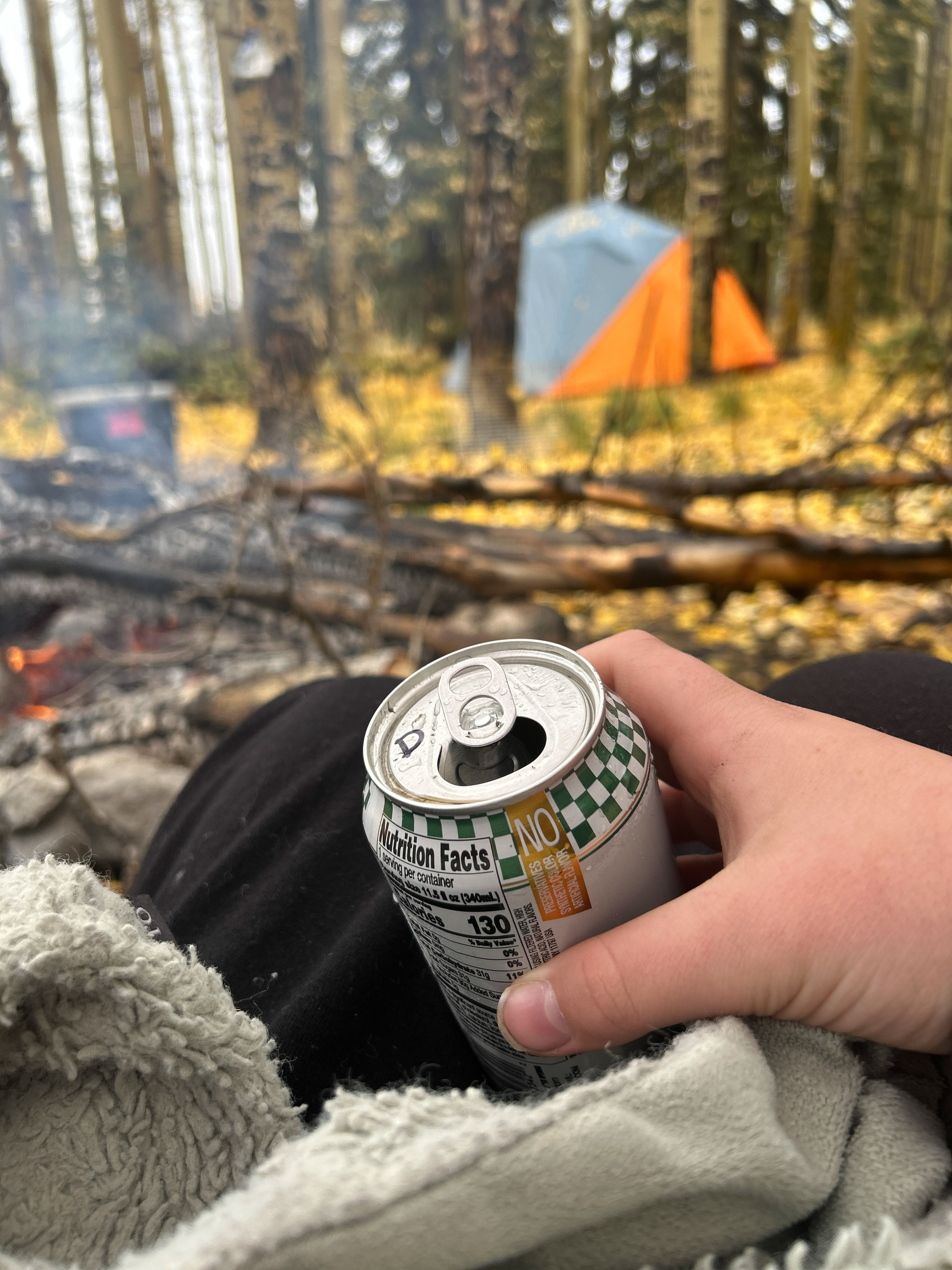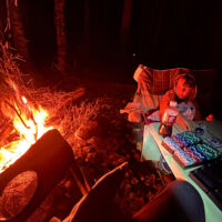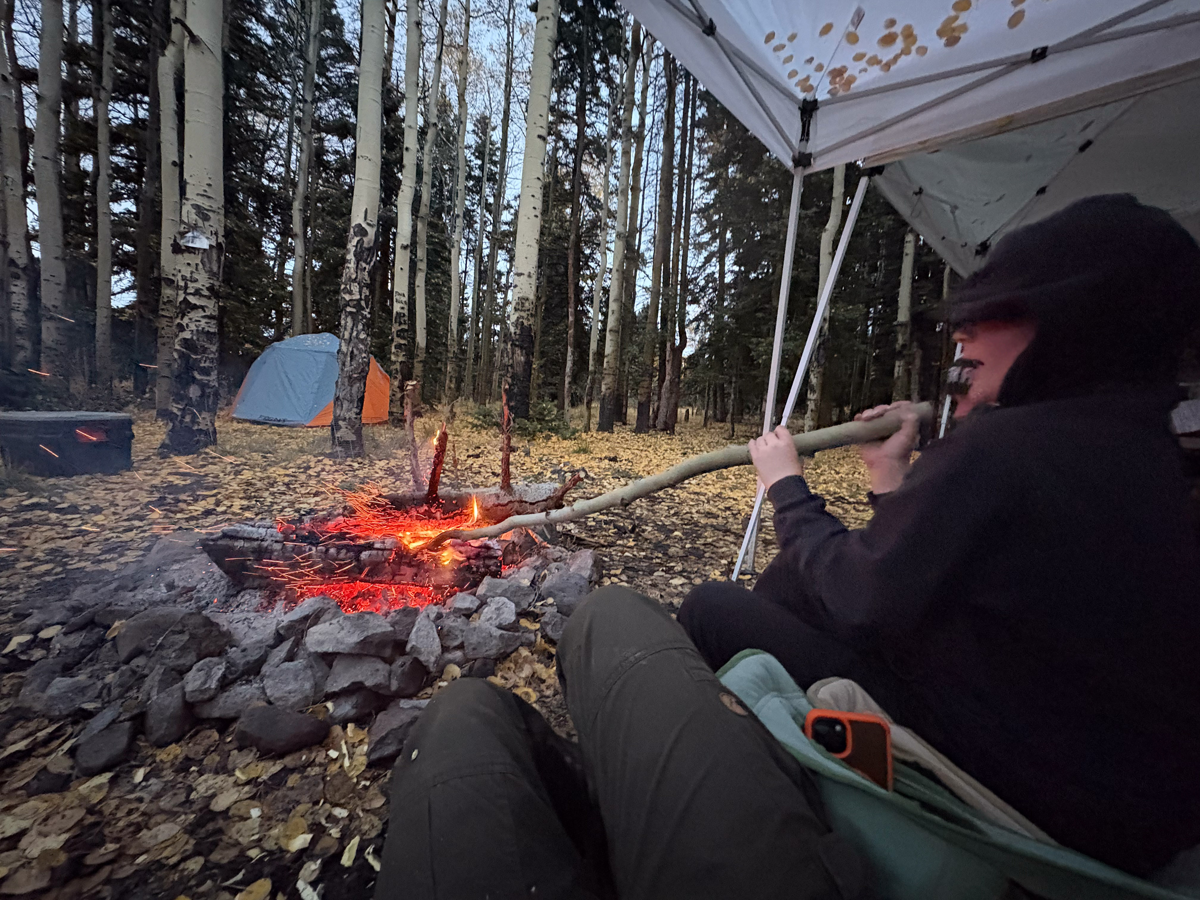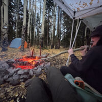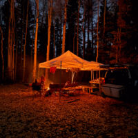 Our usual preferred spot at the end of the road was unavailable and we were rolling in around 9 PM on a Thursday night so we picked a temporary spot just to sleep for the night. The following morning we rolled back far enough to find a good spot, and it turned out to be a great choice…but for atypical reasons. Not long after setting up it started to rain, and it didn’t really stop until Sunday morning. The breeze was gentle at first but built over the weekend. The good thing is that the camp opened up to the SE and the wind consistently came from the NW so it was always filtered through the woods behind camp. The result was that we were heavily protected from the wind, and it blew consistently enough that we could bring our canopy right up to the edge of the fire pit so we could sit under the canopy but still be warmed by the fire. That’s a first for me. In all my years of camping, I’ve never before had a time when it would have been safe to put the canopy right up next to the fire like that. But the rain kept the canopy completely soaked all weekend, so there was never a danger of it drying out, getting hot and melting/burning.